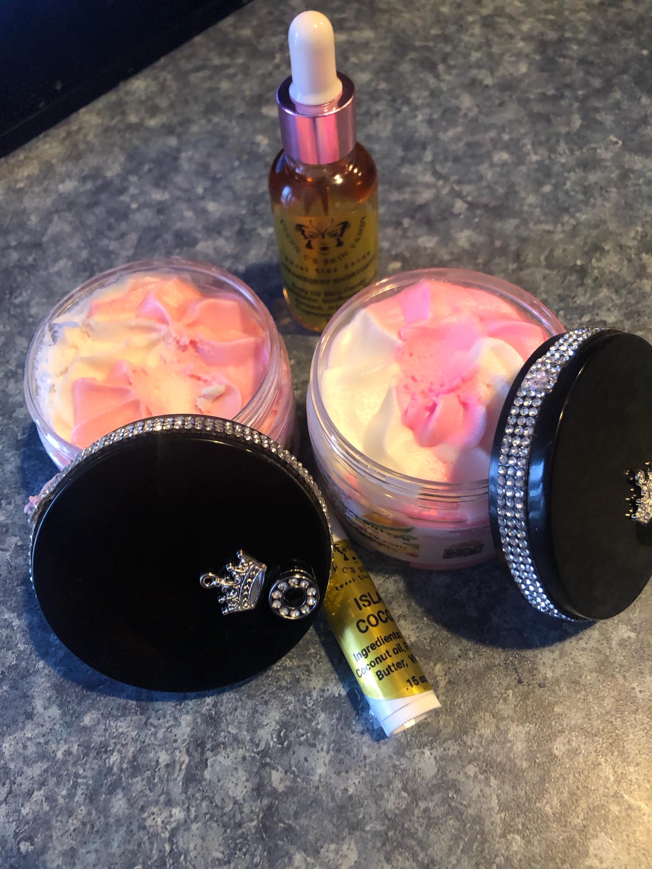Sweet, yummy, fun and amazing for your skin candy triple-whipped body butter! These Whipped Body Butters are so pretty and smells fruity like sweet candy! When the body butter is applied to the skin there may be some shimmer from the mica color. The butters are whipped together with wonderful soothing and great ingredients that are perfect for your skin. You will truly enjoy this whipped body butter. It goes on the skin so smoothly and is not greasy. All you need is a dab... a little goes a long way.